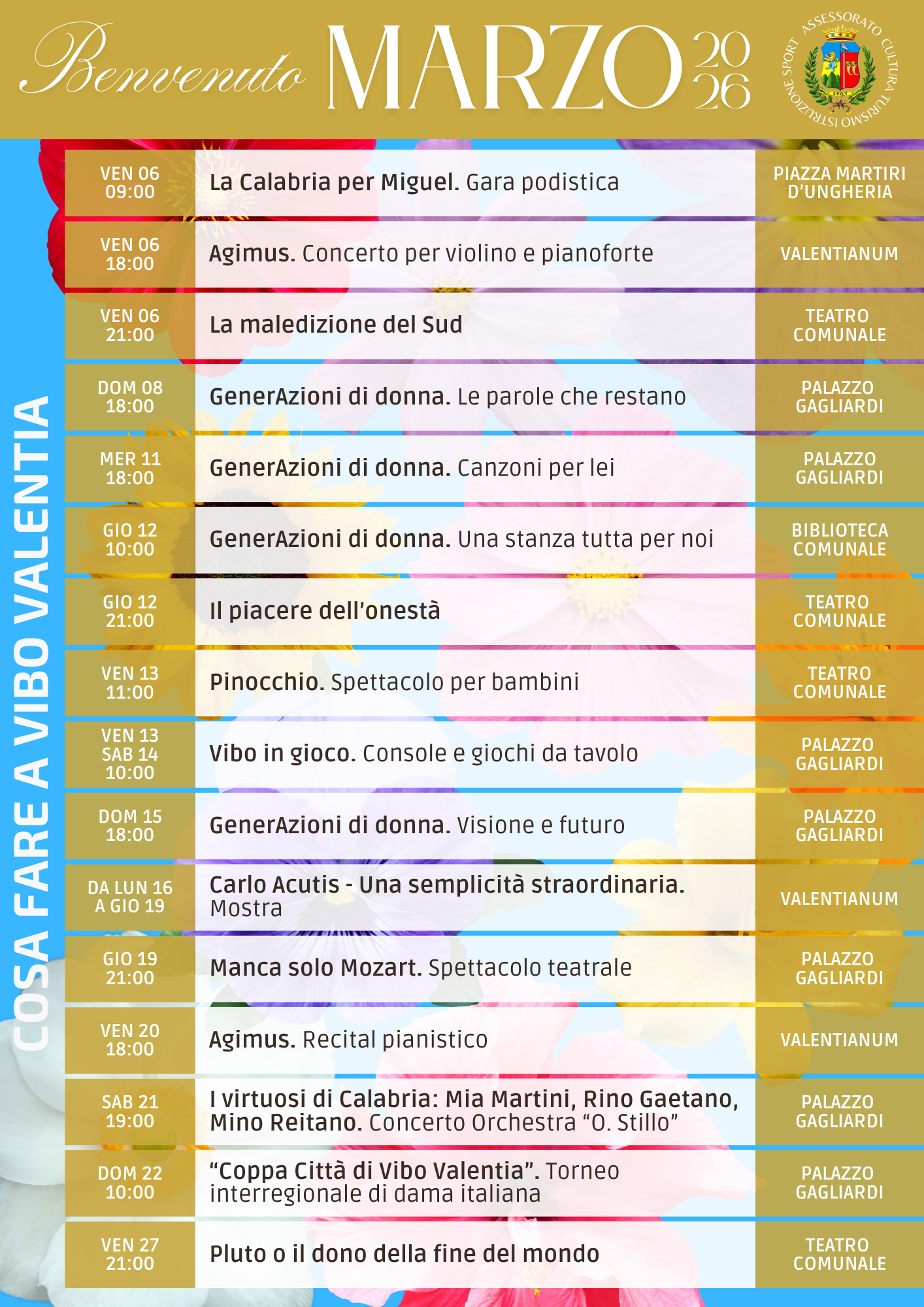 Il cartellone di “Benvenuto Marzo” propone appuntamenti dedicati alla musica, al teatro, alla letteratura, allo sport e alle attività per bambini, con una particolare attenzione ai luoghi simbolo della vita culturale vibonese: il Valentianum, Palazzo Gagliardi, il Teatro comunale e la Biblioteca.